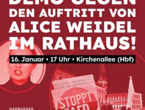 Aufruf vom Hamburger Bündnis gegen Rechts: Am Donnerstag den 16. Januar begeht die Hamburger AfD ihren Auftakt für die kommenden Bundestags-, und Bürgerschaftswahlen mit einer Propaganda-Veranstaltung mit der Bundesvorsitzenden Alice …