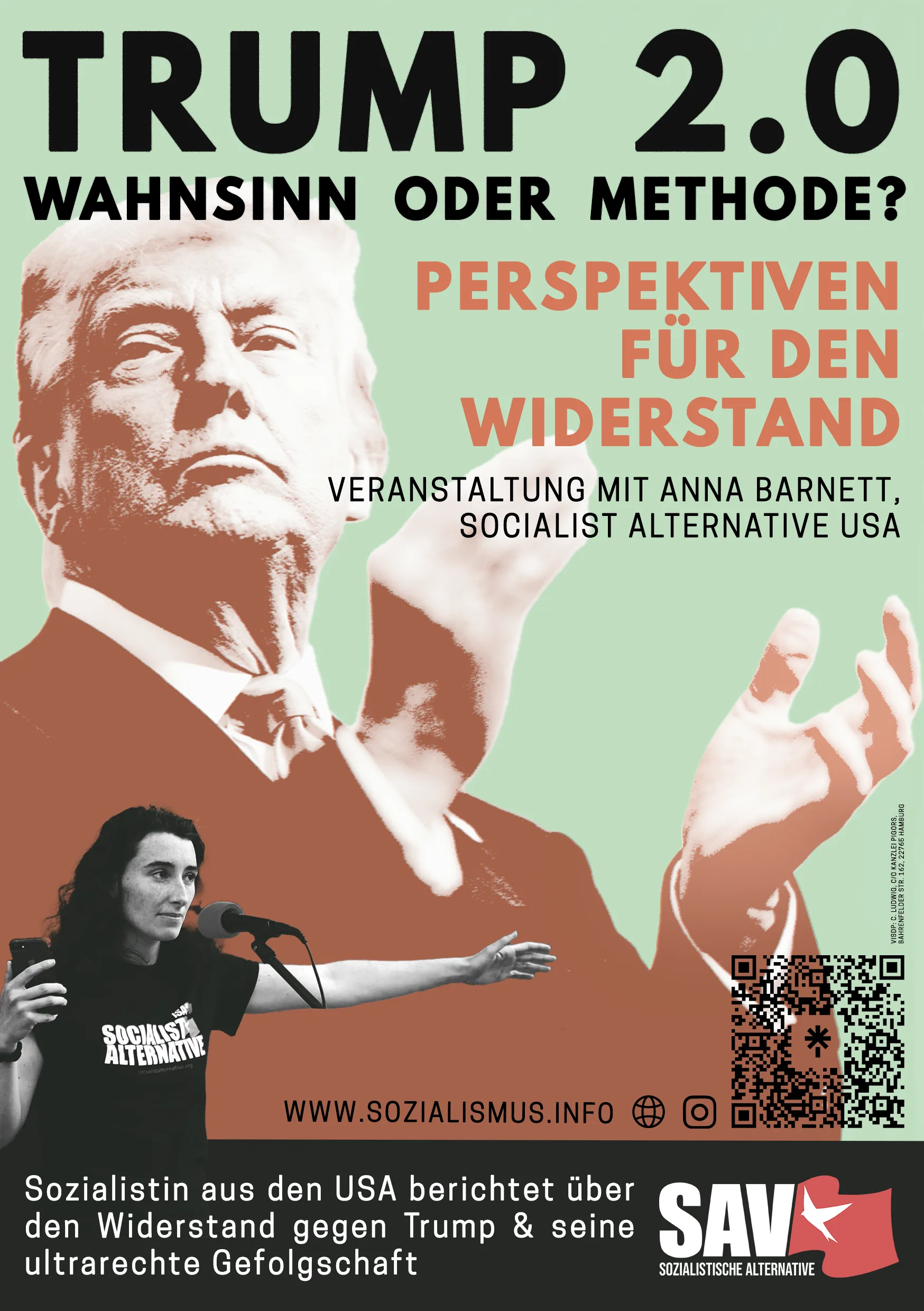 In den USA wollen Trump, seine ultrarechte Gefolgschaft und die Tech-Milliardäre den Staat repressiv umbauen, drohen mit Massenabschiebungen, greifen Gewerkschaften, Migrant*innen und Trans Personen an und wollen Sozialleistungen zerschlagen. Trump ist Ausdruck eines kapitalistischen Systems in der Krise und wirkt gleichzeitig als Brandbeschleuniger für Nationalismus, Rassismus, Sexismus, Aufrüstung, Klimakatastrophe, soziale Not und Krieg.