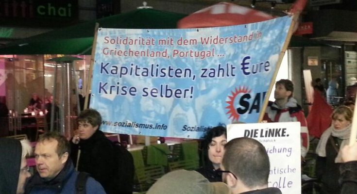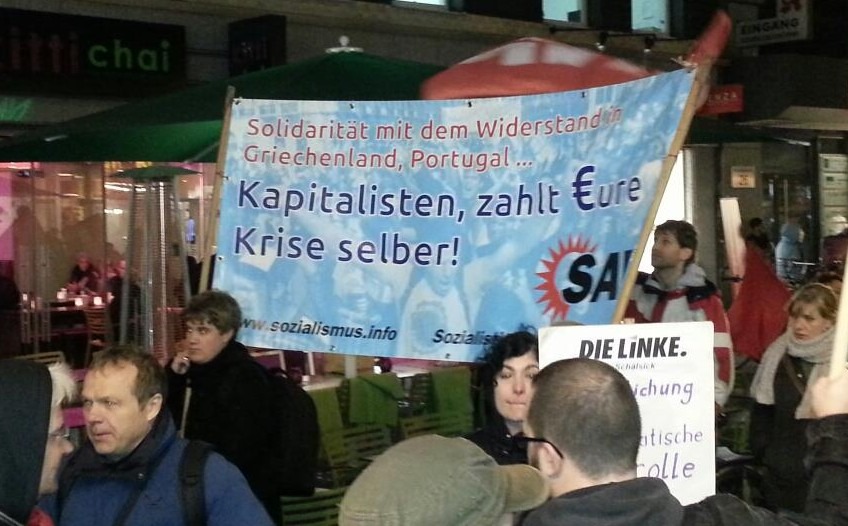 Claus Ludwig, Stadtrat der LINKEN, wies auf den Zusammenhang von europaweiter Austeritätspolitik mit den aktuell vorgelegten drakonischen Kürzungsvorschlägen für den Kölner Haushalt hin. Nach zwei Zwischenkundgebungen in der Kölner Innenstadt mit unter anderem RednerInnen aus Arbeitslosen-Initiativen zog die Demonstration ans Rheinufer zum Institut der Deutschen Wirtschaft. Dort wurde noch einmal die verheerende Rolle des deutschen Kapitals und der deutschen Politik in Europa thematisiert. RednerInnen u.a. von Antifa-Gruppen und Occupy wünschten „die ganze Bande durch eine soziale Revolution“ zum Teufel.