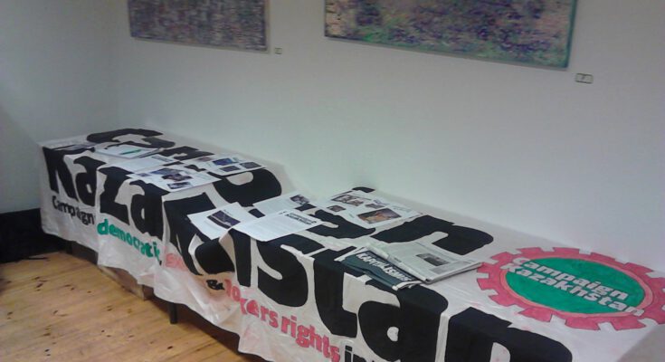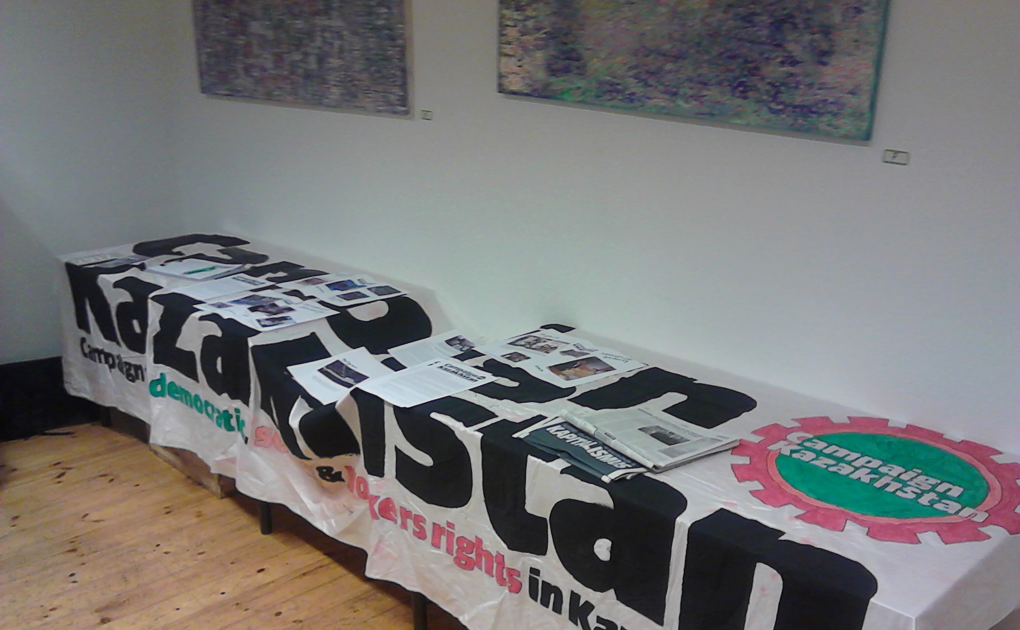Auch CampaignKazakhstan war mit Informationsmaterial vertreten. Wir wiesen in unserer Rede auf die Notwendigkeit einer antikapitalistischen Perspektive für den sozialen Widerstand gegen das Nasarbajew-Regime hin und es konnten einige neue UnterstützerInnen der Kampagne gewonnen werden. Besonders betonten wir auch das Schicksal von Vadim Kuramshin, der kürzlich zu 12 Jahren Gefängnis verurteilt wurde und dessen Freilassung eines der Hauptziele der Kampagnenarbeit der nächsten Monate sein muss und wird.