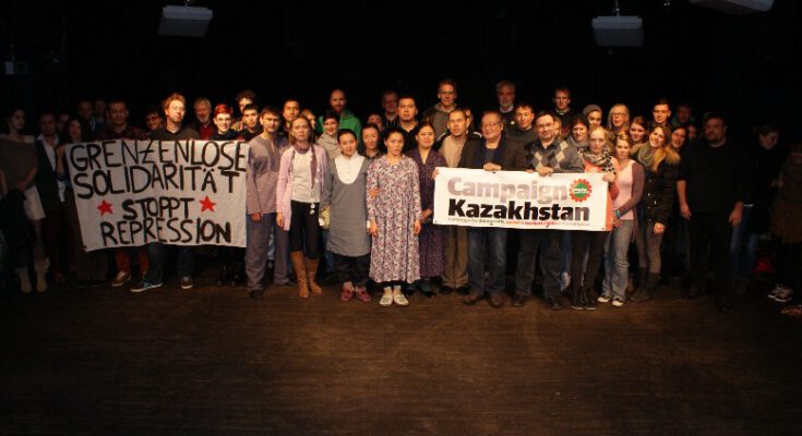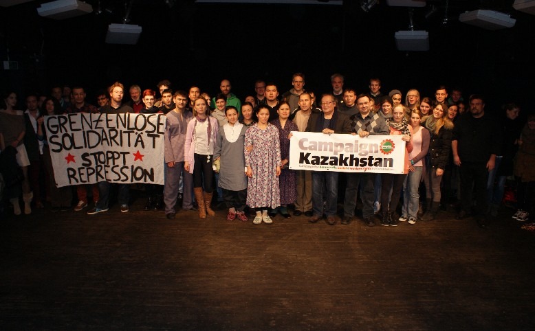 Im Anschluss an die Aufführung dankte der Regisseur den Aktivisten der “Campaign Kazakhstan“ und dem anwesenden kasachischen Gewerkschafter Ainur Kurmanov für ihre Arbeit. Ainur, führender Kopf der Schwesterorganisation der SAV in Kasachstan, der wegen seiner politischen Arbeit bereits mehrere Gefängnisaufenthalte hinter sich hat, befndet sich wie viele andere AktivistInnen zur Zeit im Exil, sein Leben ist bedroht. Als spontane Solidaritätsaktion mit dem Widerstand in Kasachstan versammelten sich Künstler und Publikum zu einem Gruppenfoto.