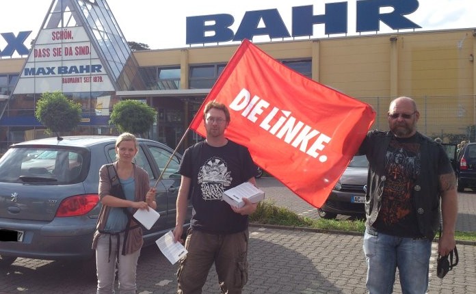 Um praktische Solidarität mit den Beschäftigten zu demonstrieren und gleichzeitig KundInnen zu informieren besuchten am 6. August Aachener LINKE-Mitglieder Filialen von Max Bahr und Praktiker. Beide Baumarkt-Ketten sind in Insolvenz gegangen, es droht der Verlust von tausenden Arbeitsplätzen, ein Drittel aller Standorte könnte geschlossen werden! Eine bereits eine Woche zuvor formulierte Solidaritäts-Adresse wurde als Flugblatt verteilt.