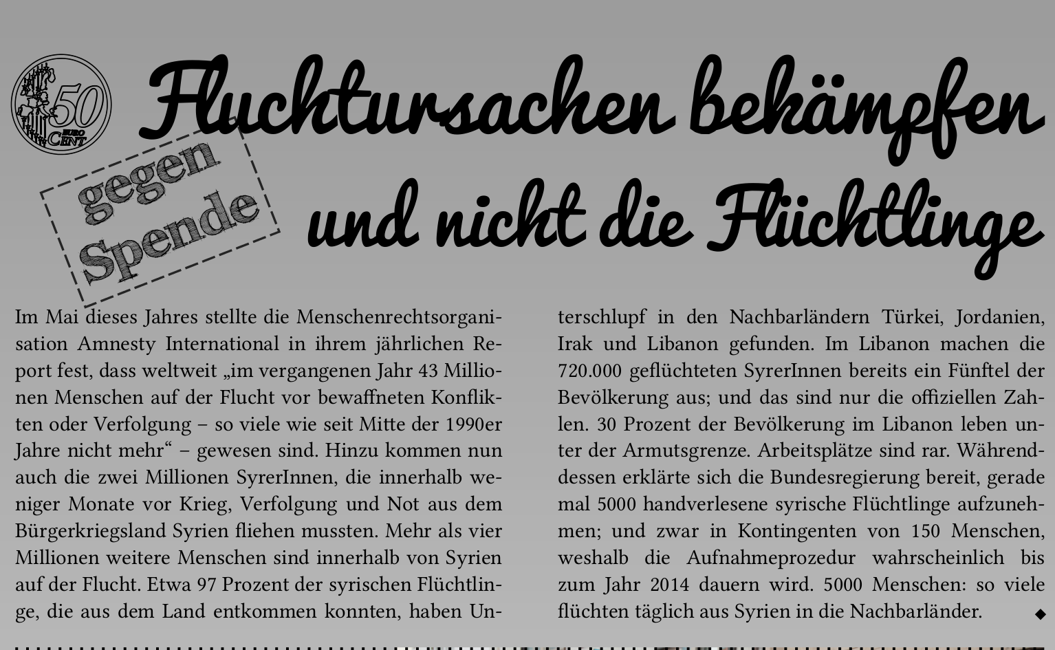Im Mai dieses Jahres stellte die Menschenrechtsorganisation Amnesty International in ihrem jährlichen Report fest, dass weltweit „im vergangenen Jahr 43 Millionen Menschen auf der Flucht vor bewaffneten Konflikten oder Verfolgung – so viele wie seit Mitte der 1990er Jahre nicht mehr“ – gewesen sind. Hinzu kommen nun auch die zwei Millionen SyrerInnen, die innerhalb weniger Monate vor Krieg, Verfolgung und Not aus dem Bürgerkriegsland Syrien fliehen mussten. Mehr als vier Millionen weitere Menschen sind innerhalb von Syrien auf der Flucht. Etwa 97 Prozent der syrischen Flüchtlinge, die aus dem Land entkommen konnten, haben Unterschlupf in den Nachbarländern Türkei, Jordanien, Irak und Libanon gefunden. Im Libanon machen die 720.000 geflüchteten SyrerInnen bereits ein Fünftel der Bevölkerung aus; und das sind nur die offiziellen Zahlen. 30 Prozent der Bevölkerung im Libanon leben unter der Armutsgrenze. Arbeitsplätze sind rar. Währenddessen erklärte sich die Bundesregierung bereit, gerade mal 5000 handverlesene syrische Flüchtlinge aufzunehmen; und zwar in Kontingenten von 150 Menschen, weshalb die Aufnahmeprozedur wahrscheinlich bis zum Jahr 2014 dauern wird. 5000 Menschen: so viele flüchten täglich aus Syrien in die Nachbarländer.