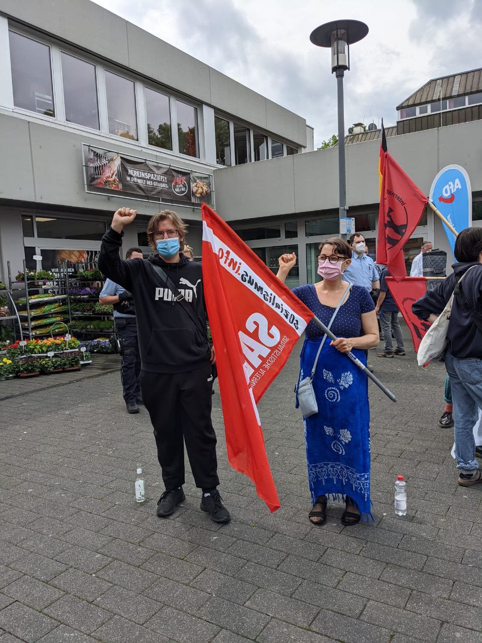 Bei dieser Stand-off-Situation blieb es erstmal. Da die AfD durch den erfolgreichen Gegenprotest einen Scheißtag hatte, erstattete sie gegen die gesamte Gegendemo Anzeige wegen ,,Verstoßes gegen das Versammlungsgesetz“. Tatsächlich fanden sich kurz danach ca. 100 Bereitschaftscops ein, die den verbliebenen Gegenprotest kesselten und von 30 Antifaschist*innen die Personalien aufnahmen. Darunter auch von SAV-Aktivist*innen.