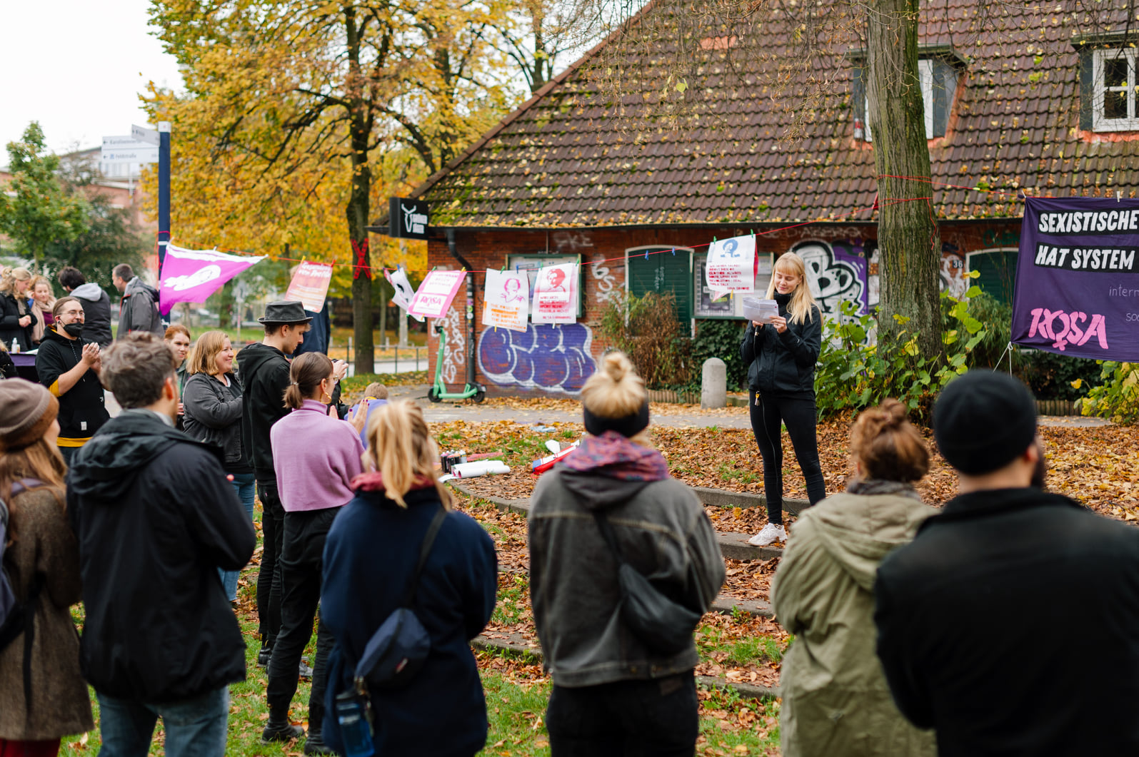 Am 30.10. fand eine von ROSA Hamburg organisierte Aktionskundgebung unter dem Motto „Sexistische Gewalt hat System – Fight back“ statt. Mit Redebeiträgen, Musik, Sexisten-Abwerfspiel, Stencils zum vor Ort sprühen und Tanz drückten über 50 Teilnehmer*innen ihre Wut und ihre Forderungen nach Sicherheit, Unabhängigkeit und Selbstbestimmung für Frauen und genderqueere Personen aus.