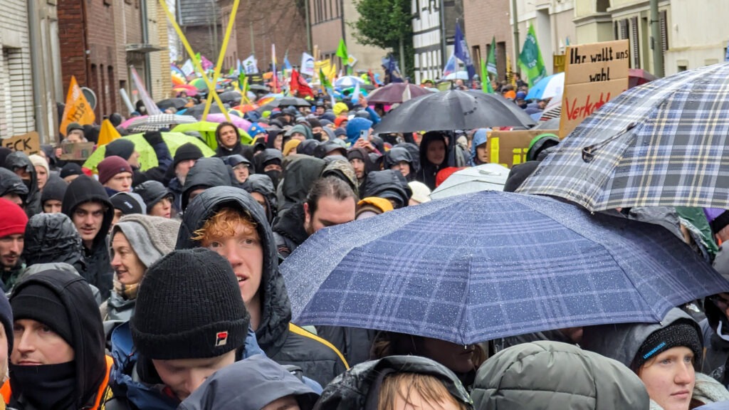 Regen, Wind, eine mühsame Anreise, mehrere Tausend Cops und gewaltige Mengen Matsch – all das hielt viele Menschen davon ab, am 14. Januar im rheinischen Kohlerevier zu demonstrieren. Trotzdem kamen mindestens 35.000 nach Lützerath. Ein unendlicher Strom von Menschen jeden Alters bewegte sich von Keyenberg zur Kundgebung, die viele wegen der Massen auf der Straße nur von Weitem mitbekamen. Viele kamen aus der Region, ganze Familien mit Kindern; auf dem Parkplatz Kfz-Kennzeichen aus dem ganzen Land.