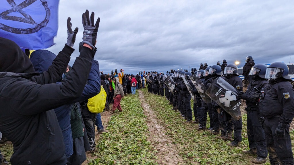 Es herrschte eine Stimmung gewaltloser Militanz. Tausende marschierten über die Felder von Keyenberg nach Lützerath, um die Räumung zu behindern. Es gab keine Entsolidarisierung zwischen “friedlichen” und “militanten” Aktivist*innen, weil sich die meisten einig sind, dass ziviler Ungehorsam gegen die zerstörerische Politik und die Energiekonzerne nötig ist. Reul sagte, man würde prüfen, ob es polizeiliche Übergriffe gegeben habe. Doch die gesamte Räumung, der gesamte Einsatz am 14. Januar war ein einziger Übergriff, eine Polizeistaatsübung, mit mindestens vier Wasserwerfern, Hunde- und Reiterstaffeln. Die Gewalt war keine Überreaktion einzelner Polizist*innen, sondern von Einsatzleitung und politischer Führung gewollt.