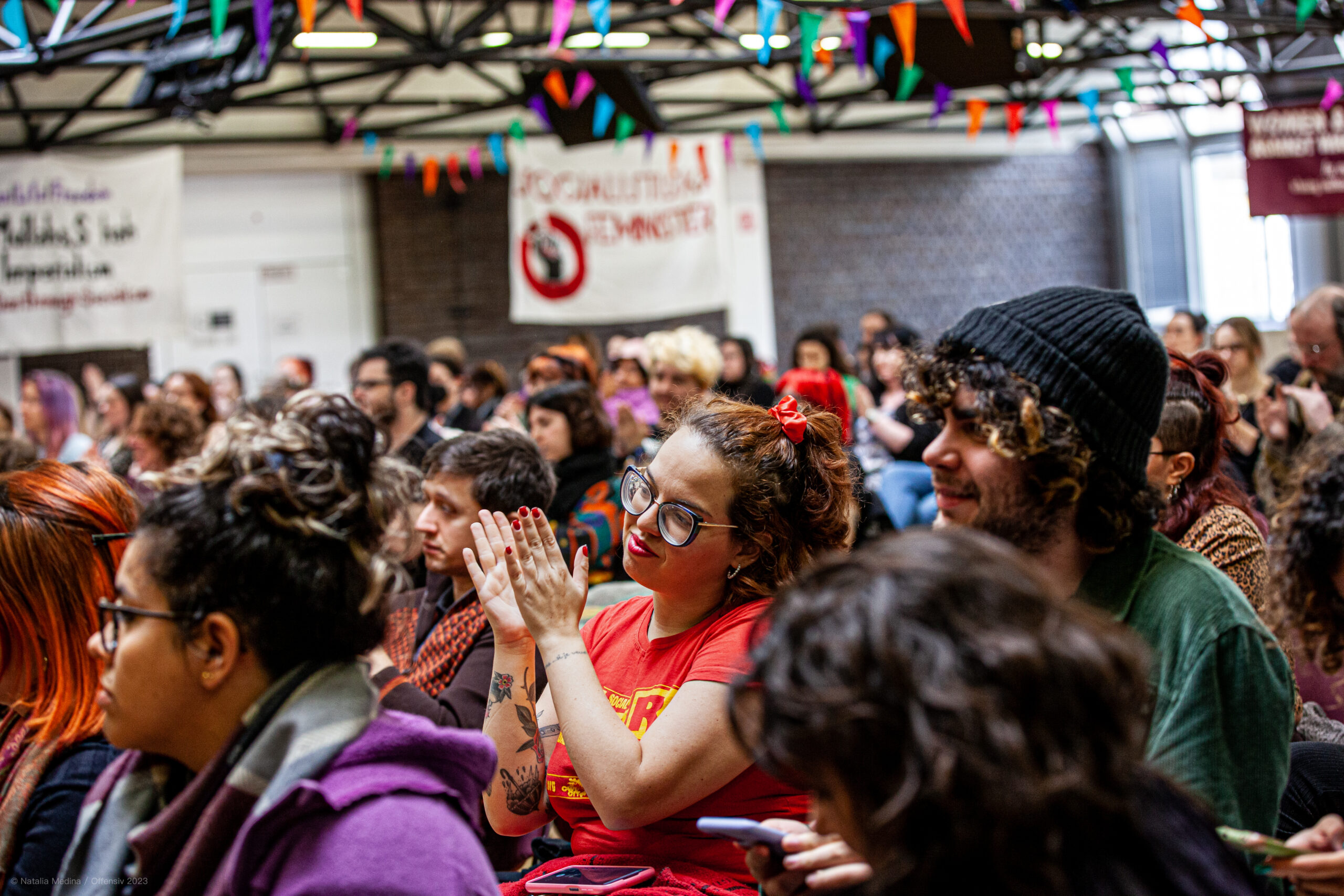 Manche Teilnehmende reisten extra aus Brasilien und Argentinien an, andere kamen aus Rumänien, Ungarn, den USA, Südafrika oder sogar Indien, um ein Wochenende lang politische Diskussionen zu führen, sich in Kommissionen zu bilden und untereinander Kontakte zu knüpfen. Der rege internationale Zulauf kommt nicht von ungefähr – mit den sich immer weiter zuspitzenden, kapitalistischen Krisen weltweit verschärft sich auch die Unterdrückung von Frauen und Queers: Femizide nehmen zu, bereits erkämpfte Rechte werden angegriffen (wie in den USA bei dem Kippen von Roe v. Wade), trans Personen fürchten um ihr Leben, werden unter massivster Diskriminierung auf dem Arbeitsmarkt in die Prostitution gedrängt und sind gemeinsam mit Frauen in jedem Land dieser Welt am stärksten und ehesten von Armut und prekären Löhnen betroffen. Das zurzeit am intensivsten beleuchtete Symbol der Kämpfe gegen geschlechterbasierte Unterdrückung und ein mörderisches Regime ist die Revolution im Iran, unter deren Banner der Kongress stattfand und die von mutigen Frauen und Mädchen angeführt wird, über die sich auf dem gesamten Globus Wellen von Solidarität ergossen haben.