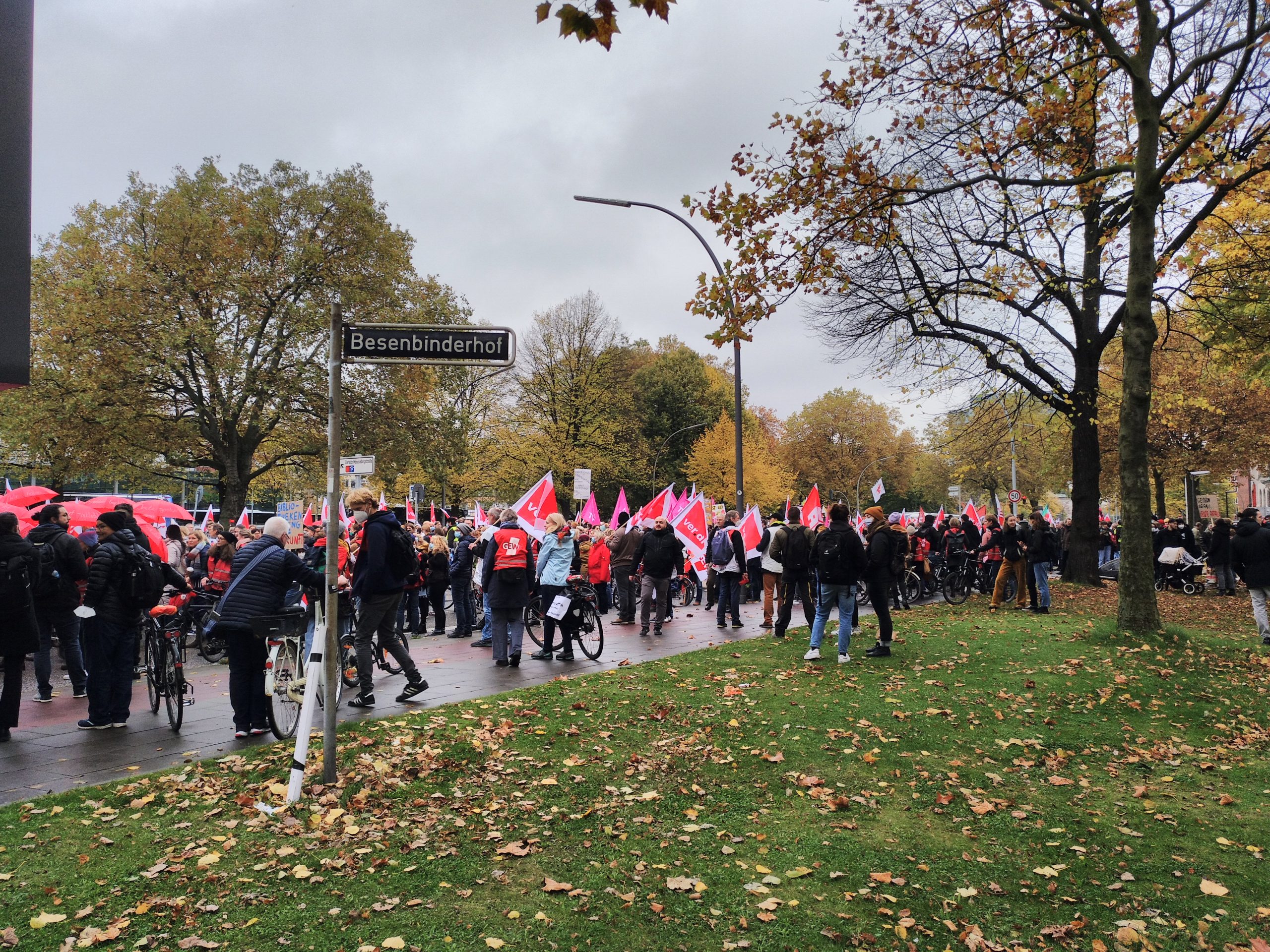 Aber Verhandlungsführer Dressel hat den Vogel abgeschossen, als er Beschäftigten aus dem SuE-Bereich den netten Tip gegeben hat, doch Wohngeld zu beantragen, wenn das Geld nicht zum Leben reicht. Einen Vorteil hat das Ganze: Der „Hohngeldvorschlag“ hat vielen Kolleginnen gezeigt, was wir den Arbeitgebern wert sind und direkt zu einer sichtbar höheren Streikbeteiligung geführt. 2000 Kolleg*innen vor der zweiten Verhandlungsrunde in Potsdam, 4000 statt erwarteten 1500 beim Streik in Hamburg am 7.11., 50% der Berliner öffentlichen Kitas dicht am 2.11… wir Kolleg*innen sind streikbereit!