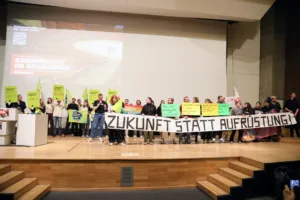 Zum Abschluss der Konferenz riefen Kolleg*innen aus den Gewerkschaftsjugenden von der Bühne des Audimaxes zum Kampf gegen Aufrüstung und Wehrdienst auf. “Sollen doch Merz und Pistorius selbst an die Front!”, so ein Jugend- und Auszubildendenvertreter von Bosch.