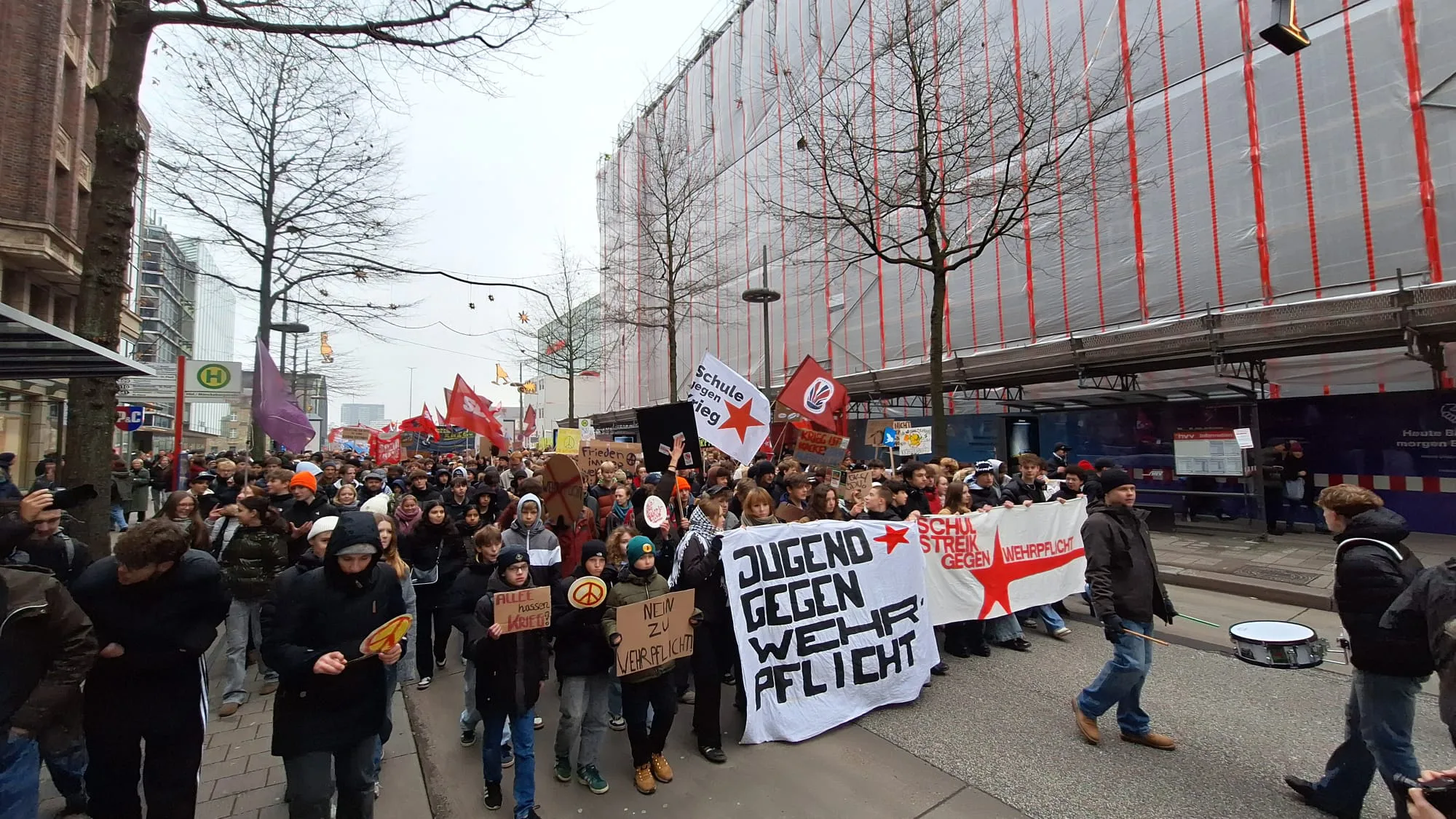 Am 5. Dezember 2025 haben 55.000 Schüler*innen gegen das neue Wehrdienstgesetz gestreikt. Für den 5. März ist der nächste Streik geplant. Wir als Kolleg*innen in den Schulen, GEW- und ver.di Mitglieder, unterstützen diesen Schulstreik und setzen uns in Schulen und gewerkschaftlichen Gliederungen für aktive Solidarität ein.