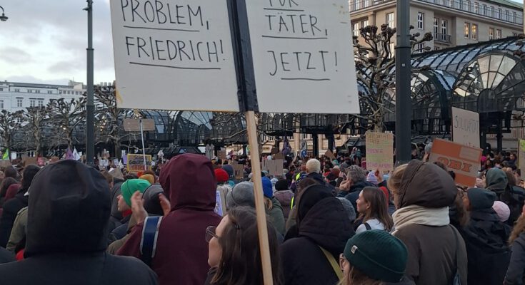 SPD und Grüne stehen mit uns auf der Straße, Parteien, die Milliarden für Aufrüstung haben – aber kein Geld, um den Mangel an Frauenhausplätzen zu beheben. Was ein Rassist wie Friedrich Merz mit Gesetzesverschärfungen als „Problem“ angehen würde, haben wir in seinen Stadtbild-Äußerungen gehört, und auch jetzt nutzt er die Debatte für seinen widerlichen Rassismus (geh bitte einfach Friedrich).