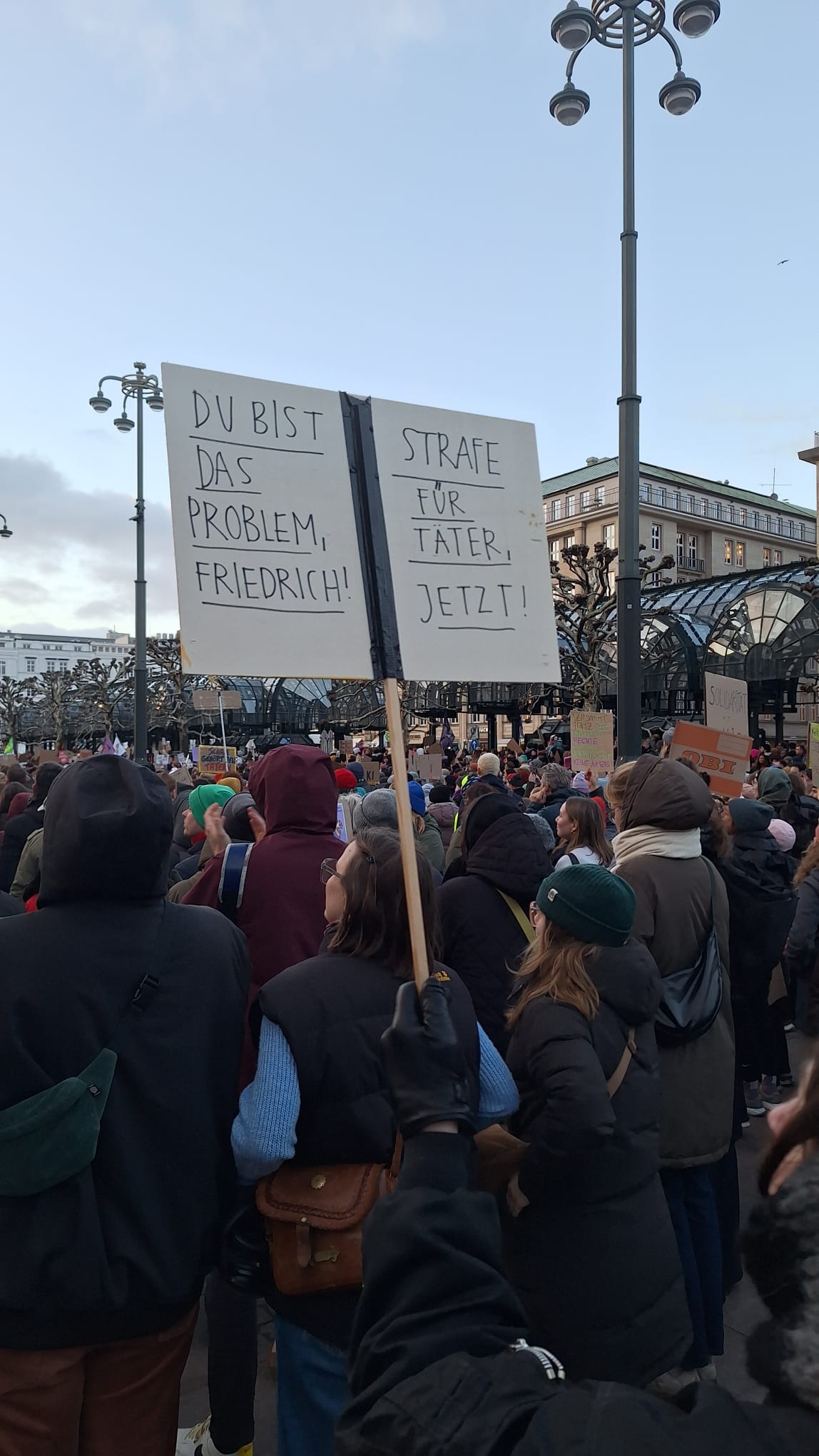SPD und Grüne stehen mit uns auf der Straße, Parteien, die Milliarden für Aufrüstung haben – aber kein Geld, um den Mangel an Frauenhausplätzen zu beheben. Was ein Rassist wie Friedrich Merz mit Gesetzesverschärfungen als „Problem“ angehen würde, haben wir in seinen Stadtbild-Äußerungen gehört, und auch jetzt nutzt er die Debatte für seinen widerlichen Rassismus (geh bitte einfach Friedrich).