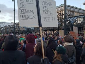 Text eines Flyers, den wir auf der Kundgebung gegen sexualisierte digitale Gewalt mit über 20.000 Menschen am 26.3. in Hamburg verteilt haben: Patriarchale Gewalt hat System Es geht nicht allein …