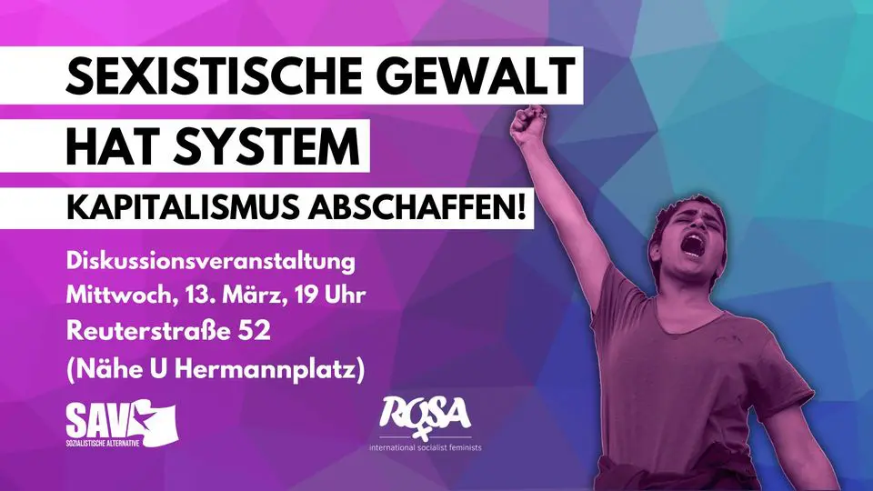 ROSA und die SAV Berlin laden euch herzlich zur Veranstaltung „Sexistische Gewalt hat System – Rechtsruck und antifeministischen Backlash stoppen – Kapitalismus abschaffen!“ ein, am Mittwoch um 19 Uhr in der Reuterstr. 52 (Nähe U Hermannplatz).