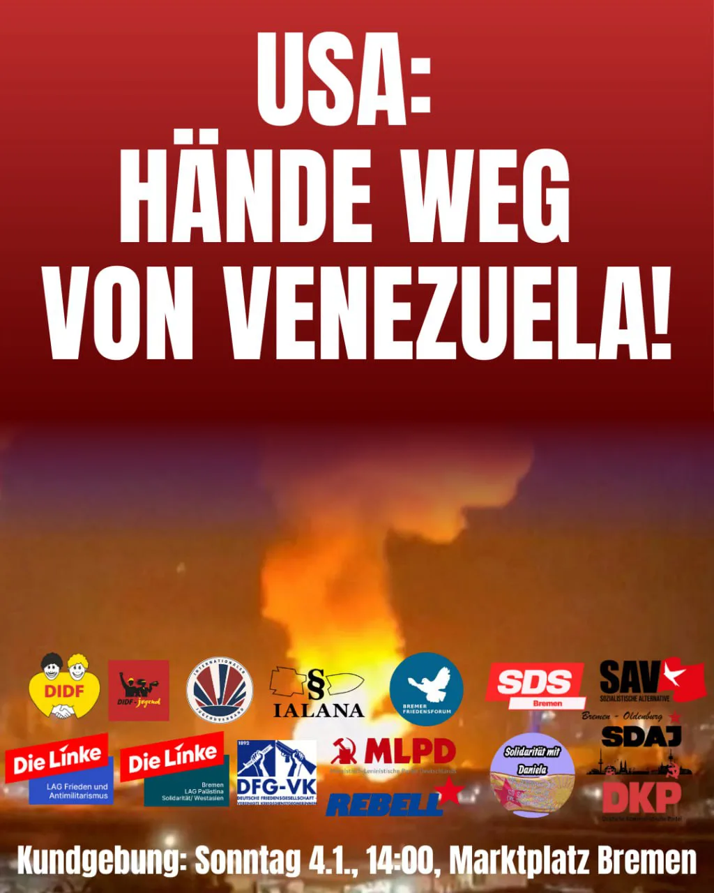 Bremen: Marktplatz Am Markt, BremenDer Angriff auf Venezuela und die Entführung seines Präsidenten Maduro durch die USA muss als das benannt werden was es ist: Eine imperialistische Einmischung in die Souveränität eines anderen Landes …
