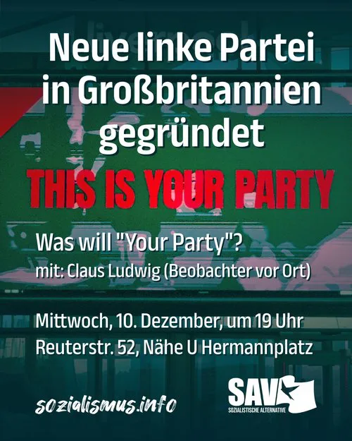 Berlin: Verein iranischer Flüchtlinge Reuterstraße 52, Berlin NeuköllnEnde November haben Jeremy Corbyn und Zarah Sultana mit vielen Mitgliedern die neue linke Partei "Your Party" gegründet. Sie weckt riesiges Interesse: Im Sommer hatten sich über 800.000 Menschen online …
