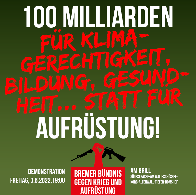 Bremen: Am Brill Am Brill, Bremen, DeutschlandAls Teil des Bremer Bündnis gegen Krieg und Aufrüstung rufen wir euch dazu auf uns am Freitag um 19 Uhr anzuschließen, wenn es darum geht der Militarisierung Deutschlands eine solidarische …